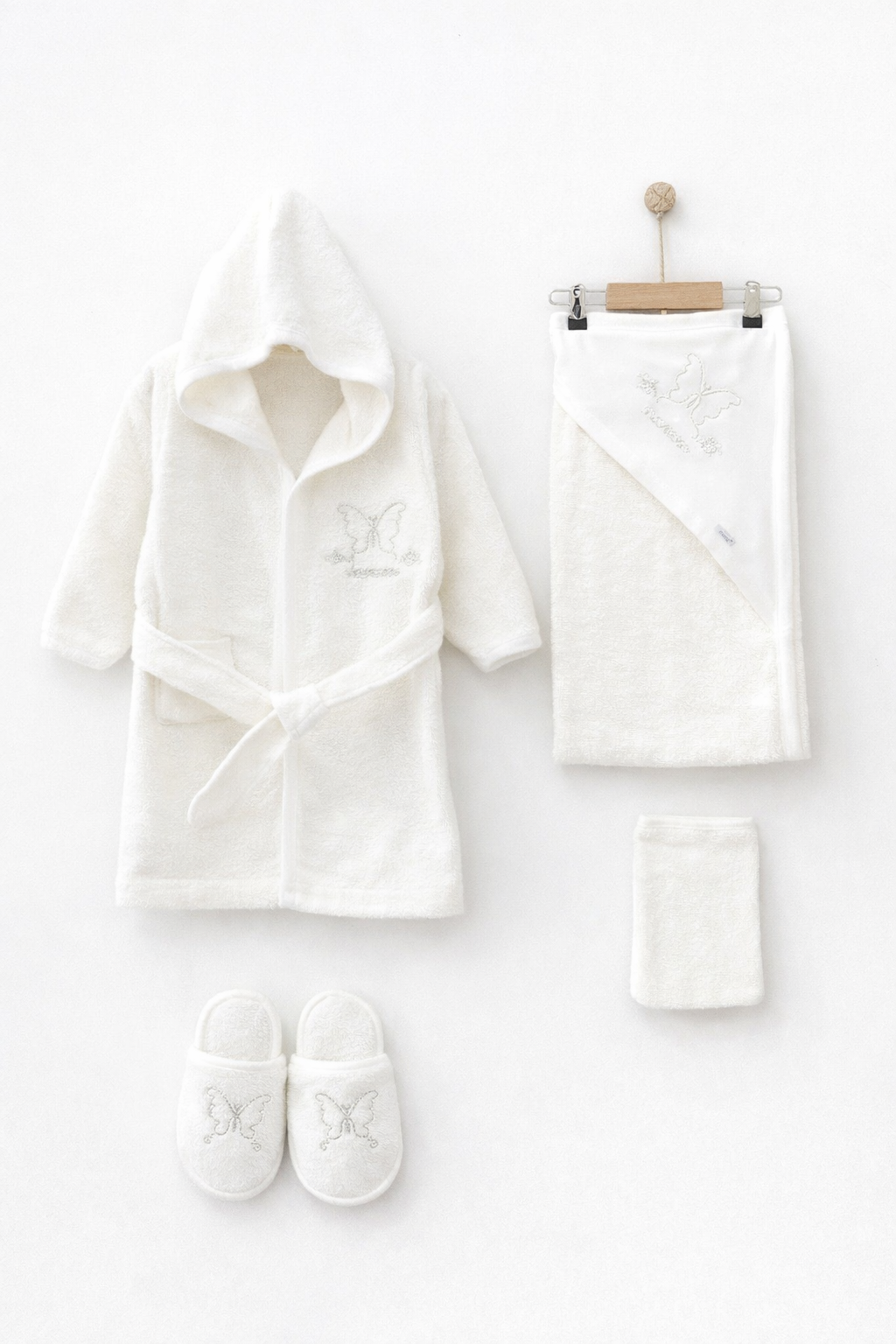 Kelebek Nakışlı 4’lü Bebek Bornoz Seti – Beyaz