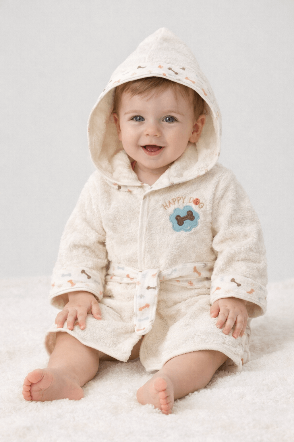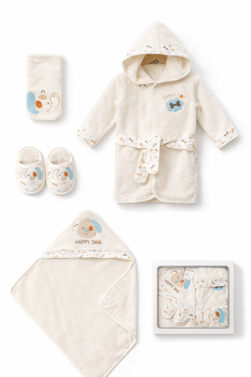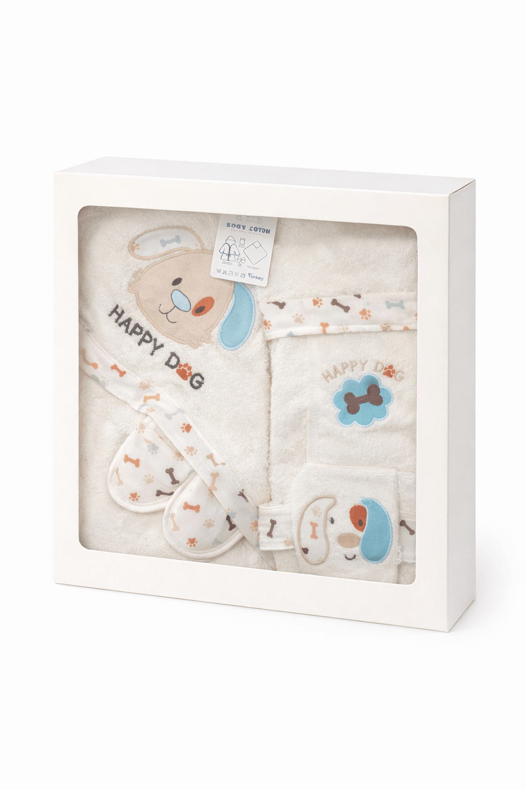 Bebeğinizin banyo sonrası konforu düşünülerek tasarlanan köpek figürlü 4’lü bebek bornoz seti; 0-24 ay.