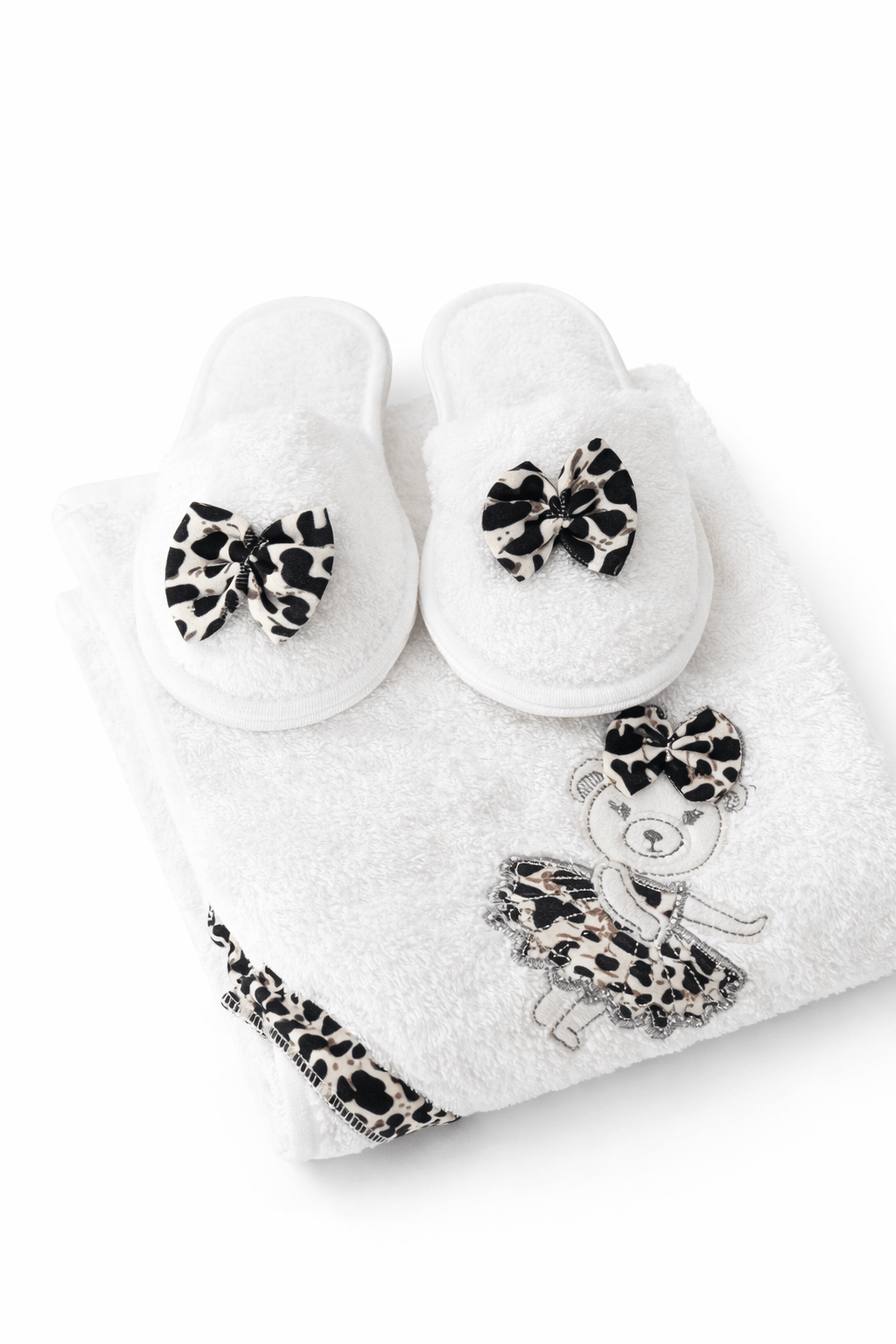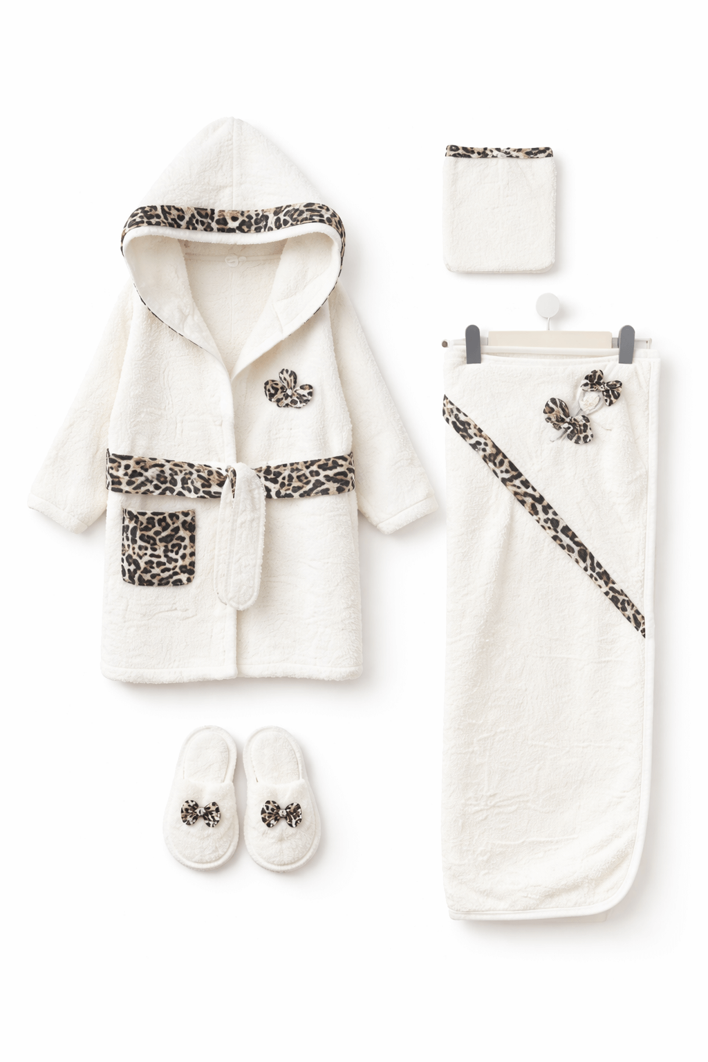 Leopar detaylı kapüşonlu bebek bornoz seti.