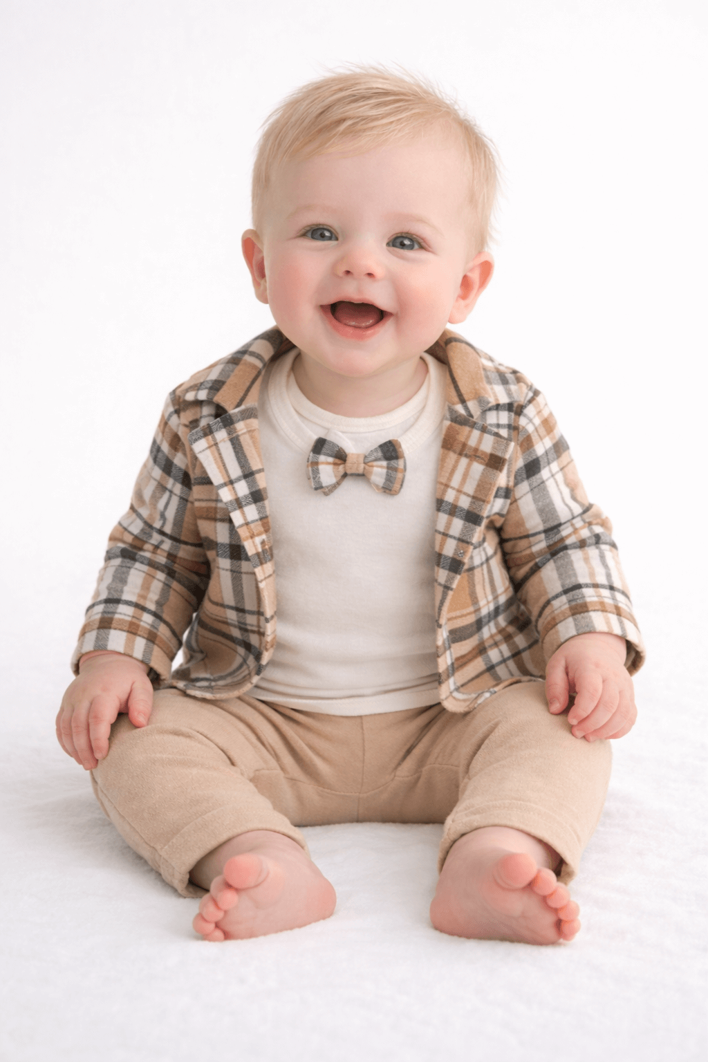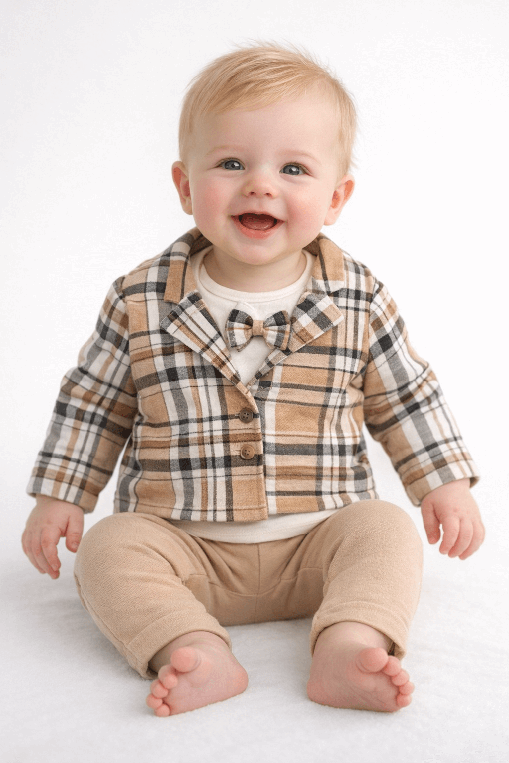 Ekose ceketli 3’lü erkek bebek takımı, özel günler için şık bir tercihtir. Takım; ekose desenli ceket, papyonlu üst ve uyumlu pantolondan oluşur.